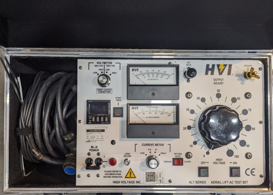 The High Voltage Inc. ALT-120/60 is a portable AC hipot test set designed for testing the dielectric strength of aerial lifts, booms, bucket trucks, and liners, meeting ANSI 92.2 standards. 1 It can also be used for AC over-voltage withstand testing on larger capacitive loads. Key features include a continuously adjustable AC voltage, a 2-range voltmeter, a multi-range current meter, and a built-in timer. It has a gapped core transformer for up to 7.2 kVA of output power. 1