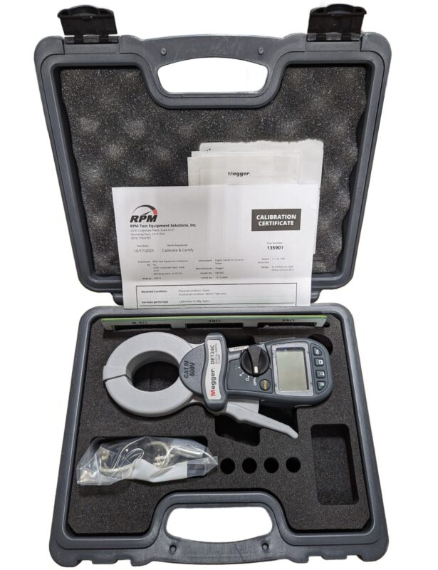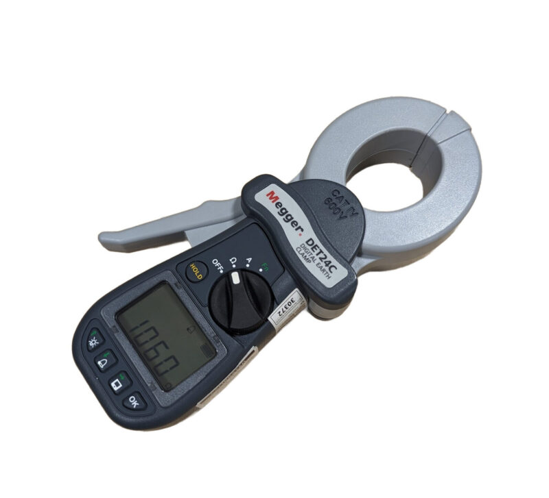 The Megger DET24C is a digital clamp-on ground resistance meter. It is a portable, battery-operated instrument that can be used to measure the resistance of ground rods, grids, and other grounding systems without the need for auxiliary grounding rods. The DET24C simply clamps around the ground conductor or rod and measures the resistance to ground.