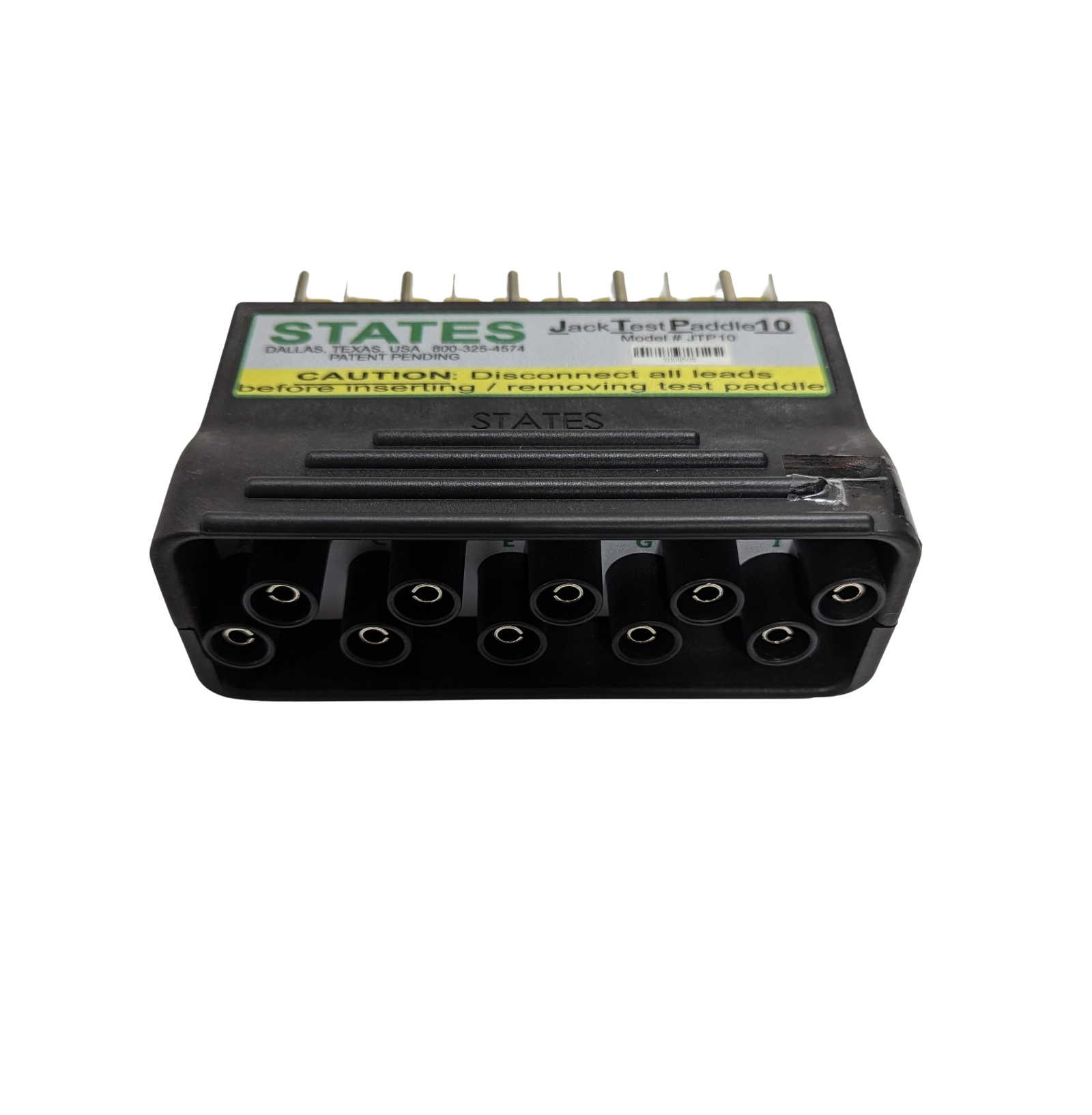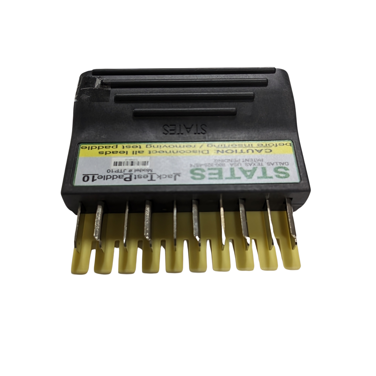 States JPT10 is a test plug used in conjunction with the current shunt jack on States test switches. It provides a safe, quick connection for indicating or testing instruments without opening current transformer secondaries or disturbing permanent wiring. The plug is easily inserted at right angles to the test block.